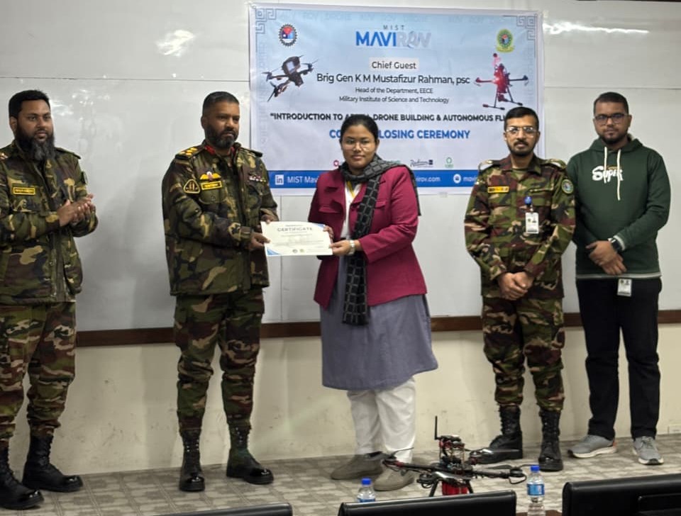MIST Mavirov, a student-led research team under the supervision of the EECE Department, successfully concluded the "Introduction to Aerial Drone Building and Autonomous Flight” course, with a closing ceremony held today. A total of 63 students from various departments of MIST participated in this 4-day, hands-on and theory-based course, gaining practical experience in aerial drone construction and autonomous flight systems. The course culminated in a field test on the final day, where participants applied their knowledge through real-time flight operations.